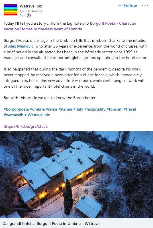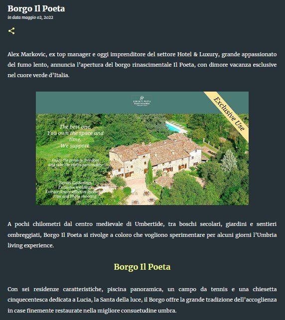 Newest trends in the greenest heart of Italy, 4 km from Niccone Valley and "Strada del Vino ", on the country path called Strada " Borgo il Poeta" sits the hamlet which bears the same name dominating the upper Tiber River Valley (Tevere ) midway between Città di Castello and Umbertide, looking across at the fine medieval village of Montone.