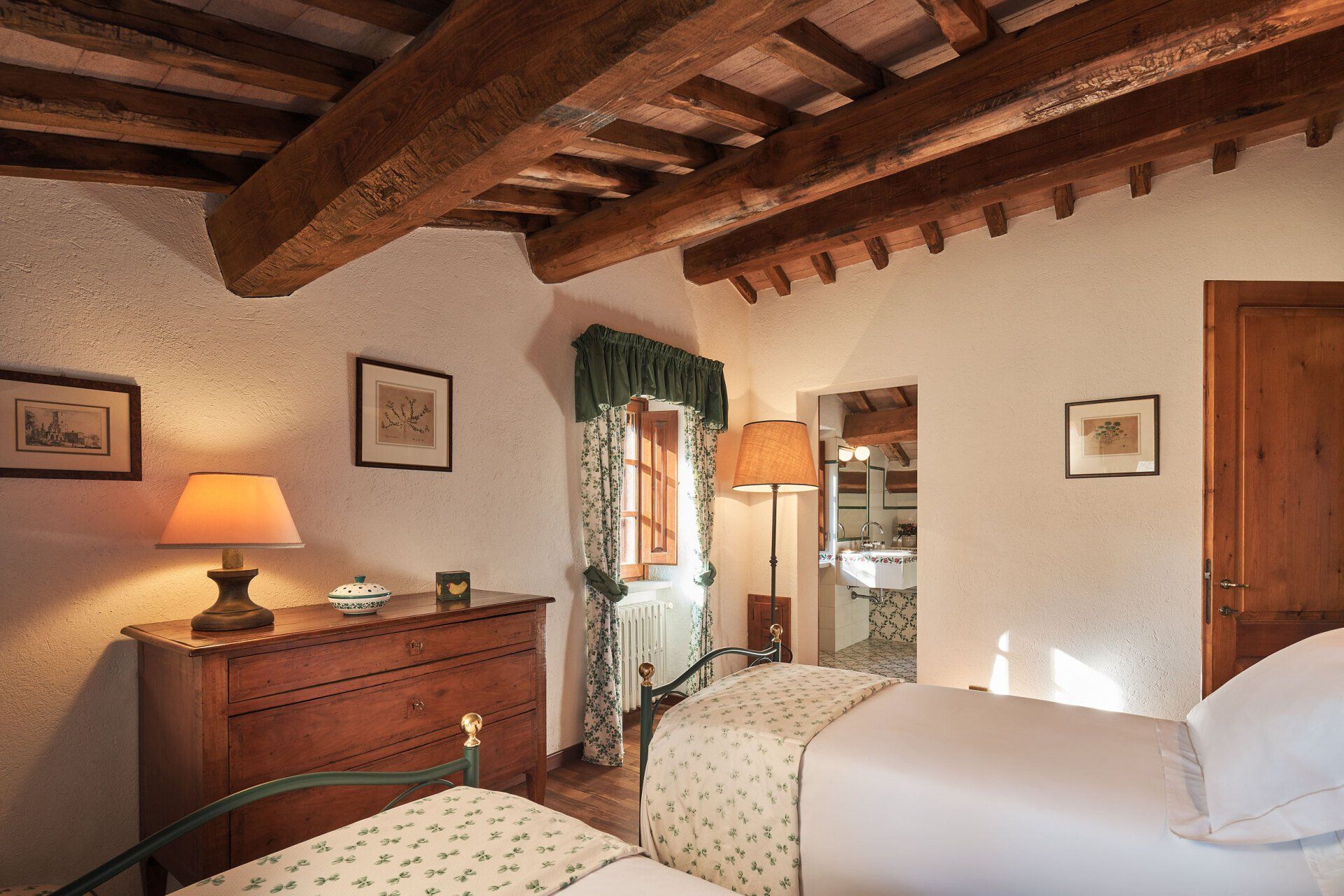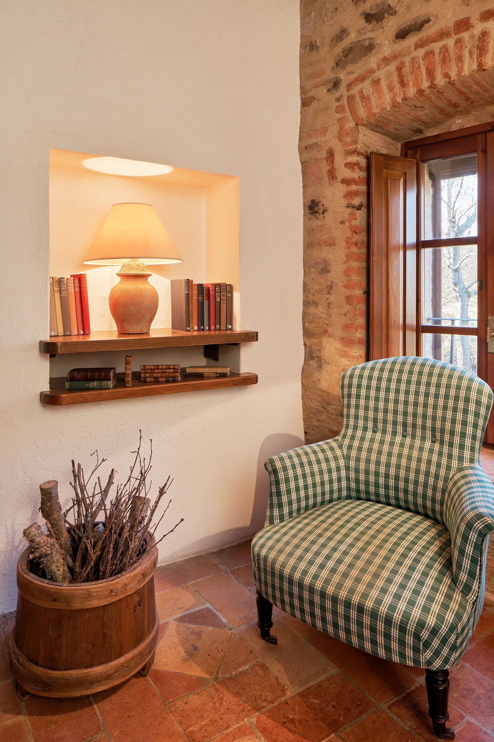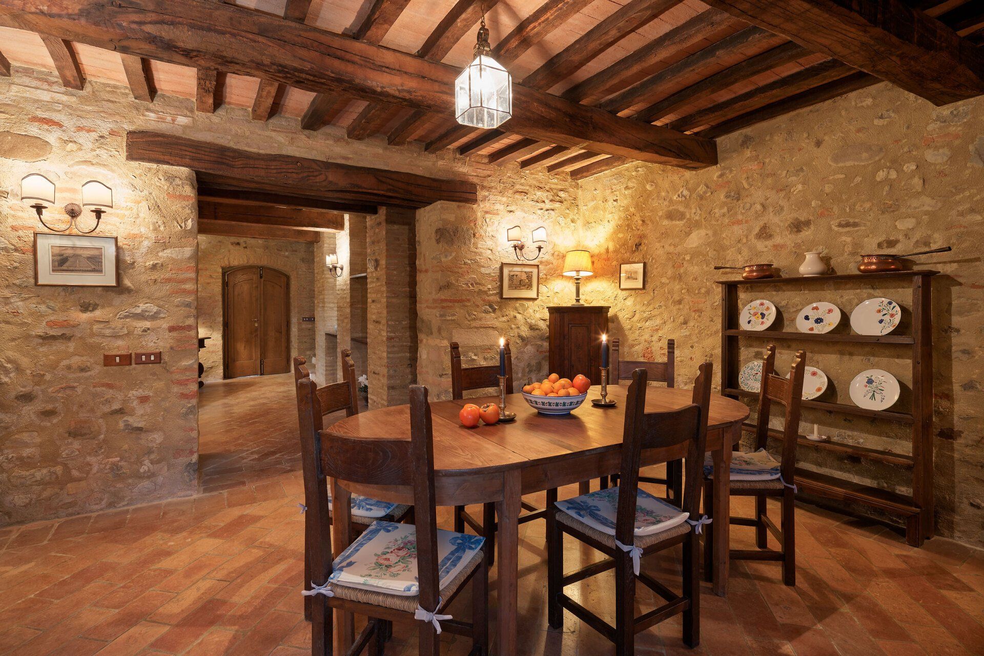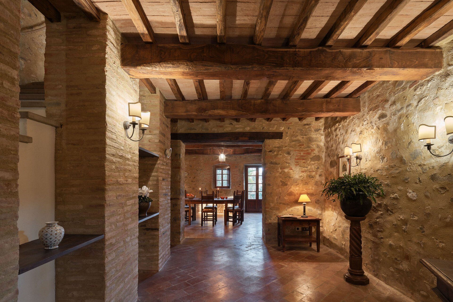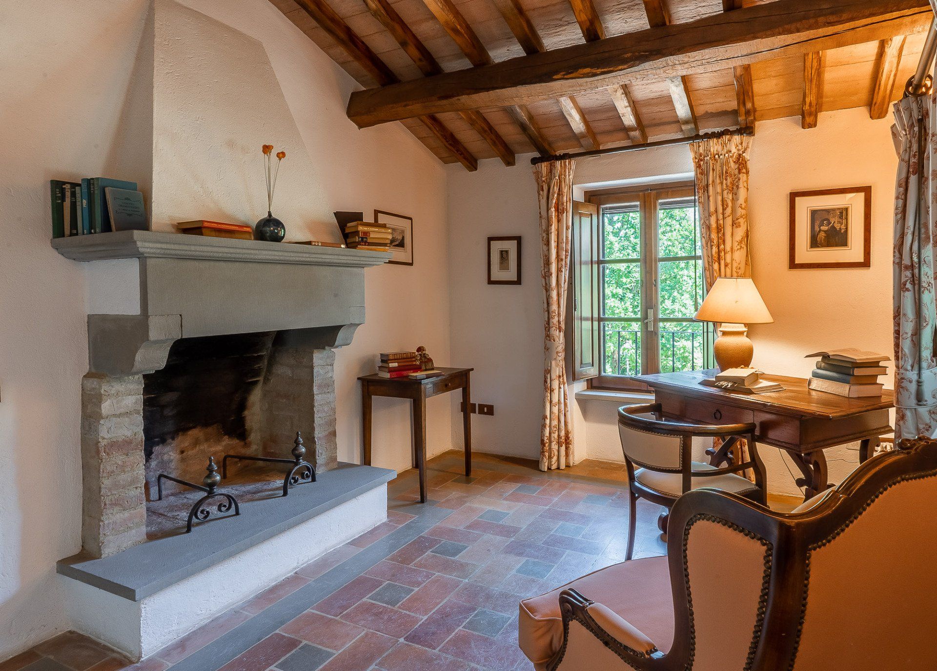 يحتوي الردهة الكبيرة والرائعة في Casa Monte على مكتب للكتابة، وتؤدي إلى غرفة الطعام حيث توجد طاولة طعام خشبية بيضاوية، وتؤدي خلفها الأبواب الفرنسية إلى الفناء المركزي. يؤدي المطبخ المغطى بالبلاط الأزرق والأبيض إلى غرفة الطعام. يصعد درج حجري إلى الطابق الأول حيث تجد غرفة الجلوس المشرقة ومتجددة الهواء، والتي لا تزال تحتفظ بالمدفأة الأصلية. تؤدي أبواب غرفة الجلوس إلى الدرج الخارجي لـCasa Monte، والذي توجد عند سفحه منطقة جلوس خاصة. وتؤدي غرفة النوم المزدوجة والحمام الداخلي إلى غرفة المعيشة. وتقع غرفة النوم الرئيسية التي تحتوي على سرير حديدي مغطى ذو أربعة أعمدة في الطابق الثاني. تحتوي هذه الغرفة على تراس خاص بها مع إطلالات رائعة على Montone وتحتوي على حوض استحمام داخلي وحوض ويمكن للضيوف استخدام مرحاض منفصل. توجد أيضًا غرفة نوم توأم مع حمام داخلي في الطابق الثاني.