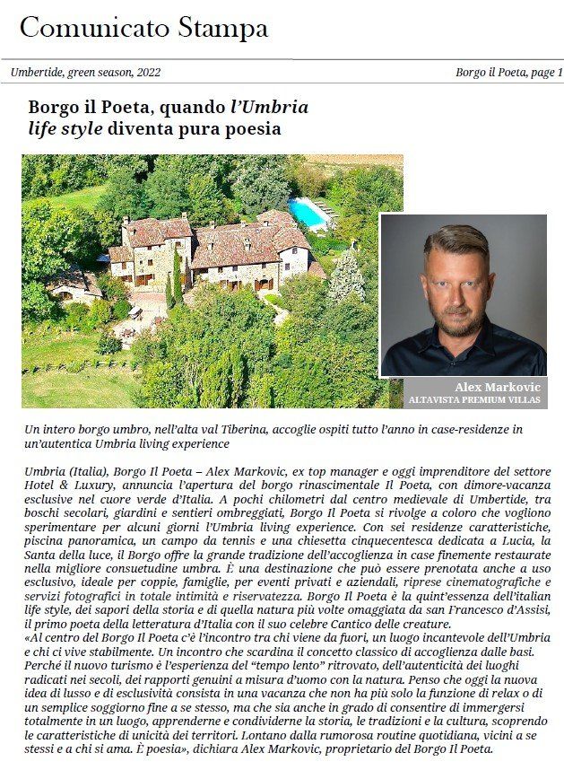 Las últimas tendencias en el corazón más verde de Italia, a 4 km del valle de Niccone y de la "Strada del Vino", en el camino rural llamado Strada "Borgo il Poeta" se encuentra la aldea que lleva el mismo nombre, dominando a mitad de camino el alto valle del río Tíber (Tevere). entre Città di Castello y Umbertide, mirando al bonito pueblo medieval de Montone.
